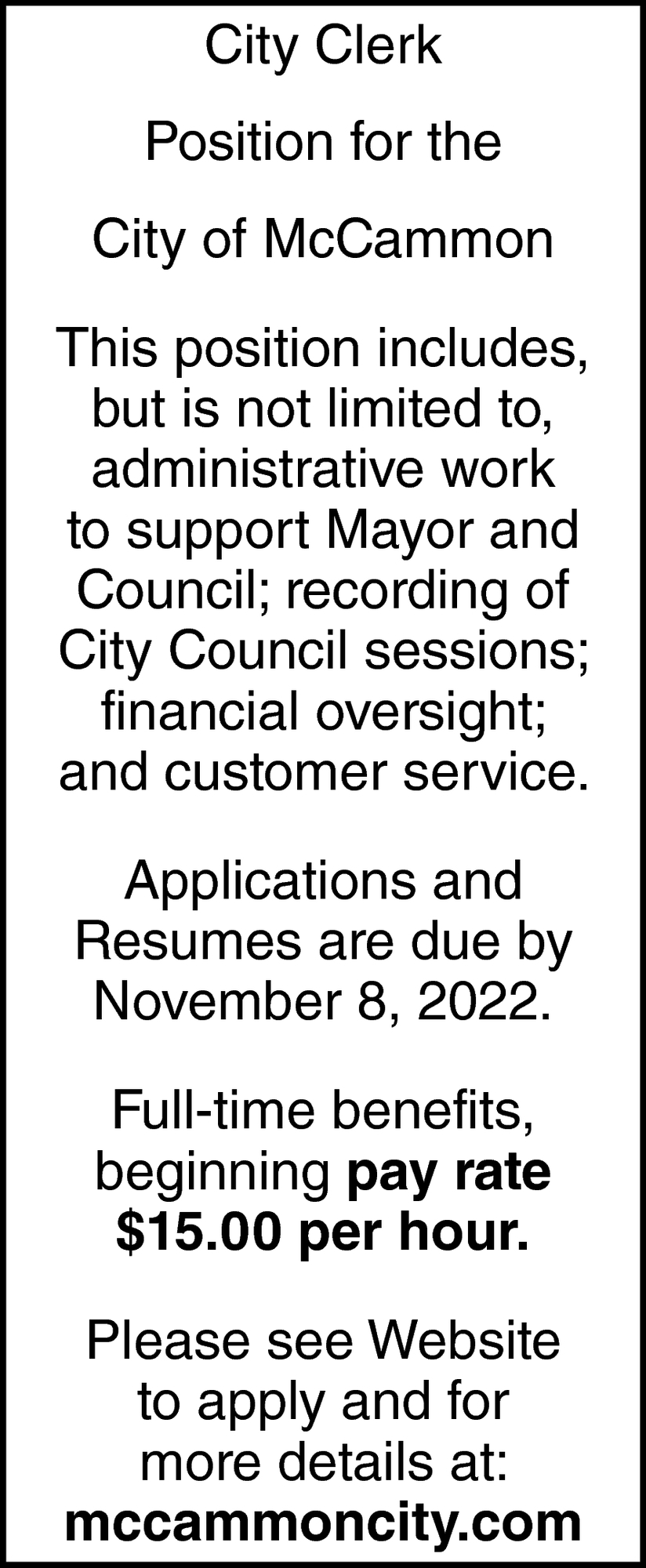 Oct 21, 2022. City of McCammon Government Jobs from East Idaho Jobs