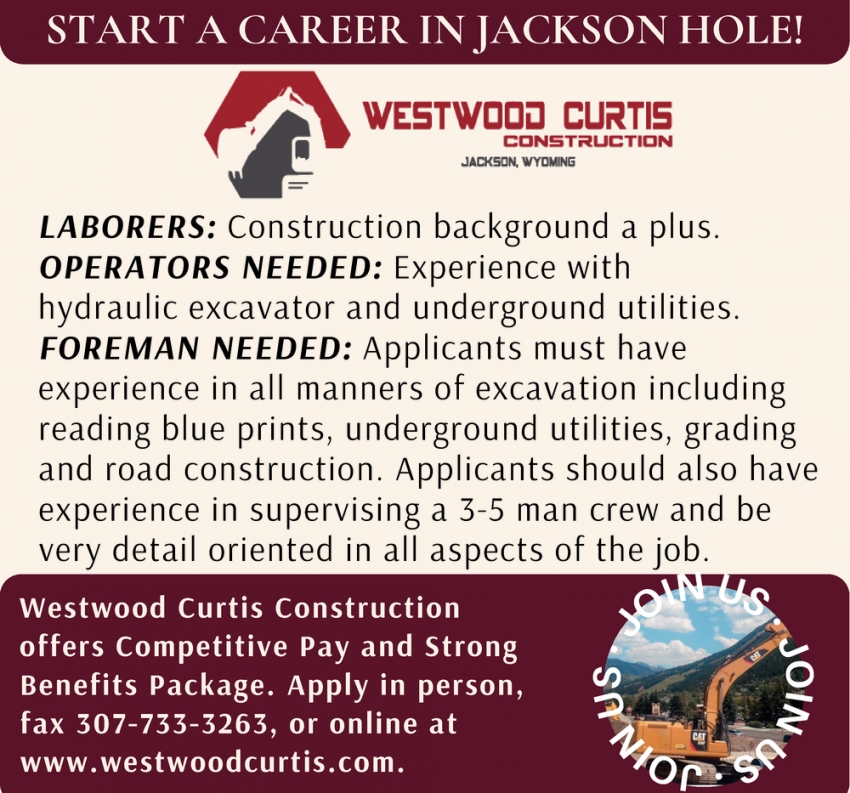 Jobs for Westwood Curtis Construction in Jackson, WY