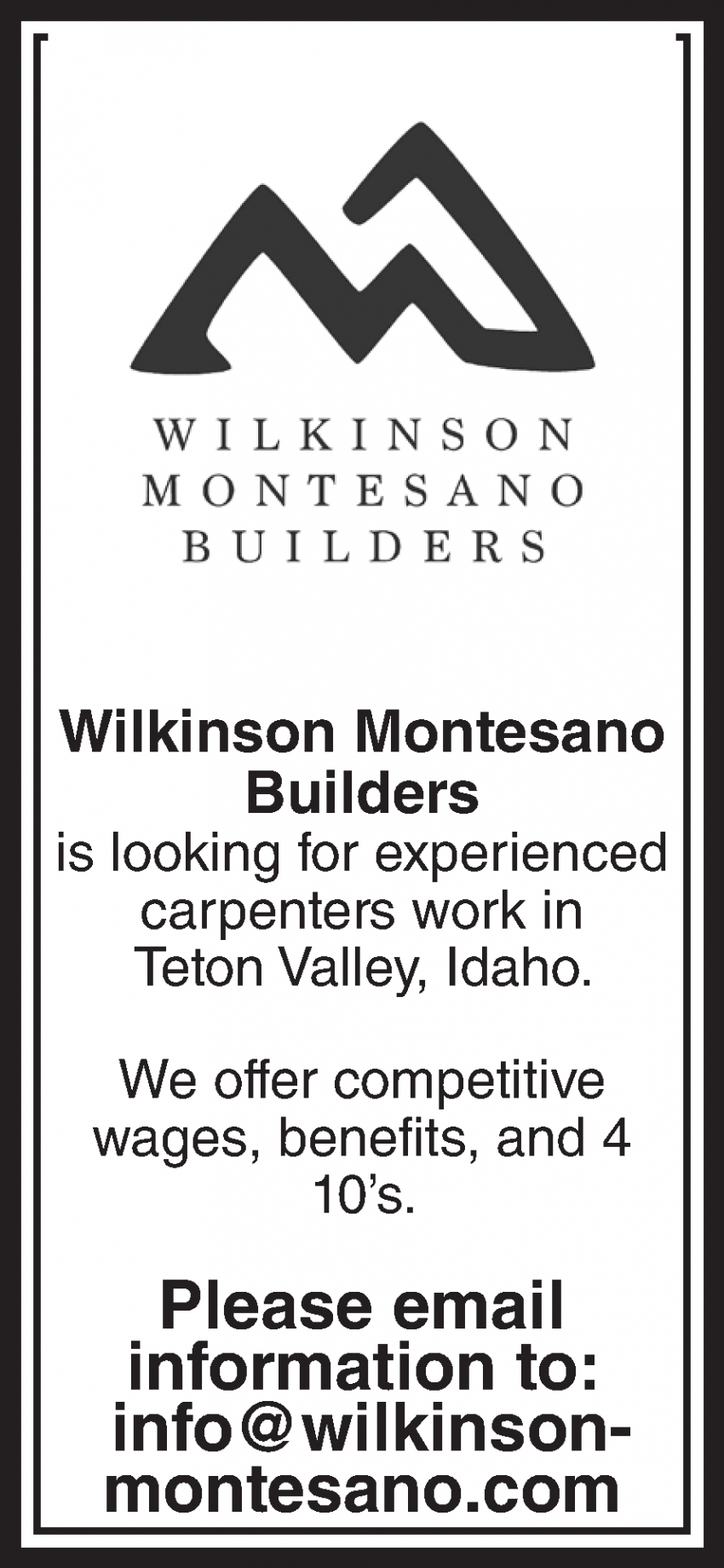 Jobs for Wilkinson Montesano Builders in Driggs, ID