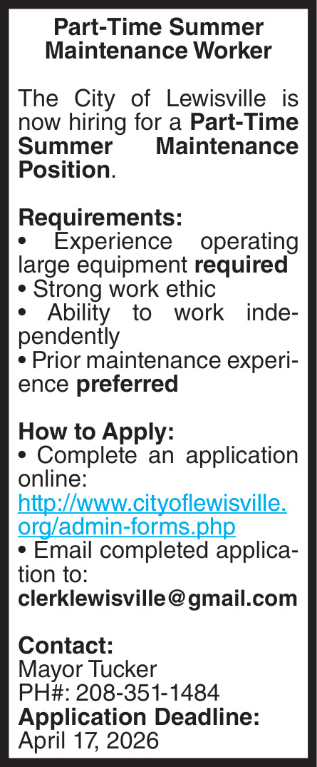 Jobs for City of Lewisville in Lewisville, ID